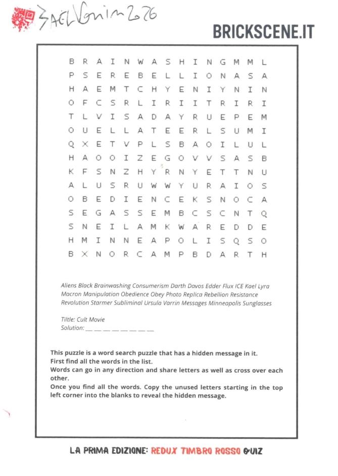 “La Prima Edizione: Redux Timbro Rosso Quiz”, con tiratura 1/1, timbrata, datata e firmata dall’artista + Word Search Game con frase nascosta con tema Cult Movie. 25 uniche cartoline che non sono semplici stampe: sono piccoli pezzi di un percorso artistico costruito a mano, una alla volta.