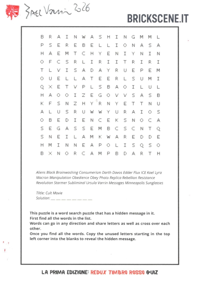 “La Prima Edizione: Redux Timbro Rosso Quiz”, con tiratura 1/1, timbrata, datata e firmata dall’artista + Word Search Game con frase nascosta con tema Cult Movie. 25 uniche cartoline che non sono semplici stampe: sono piccoli pezzi di un percorso artistico costruito a mano, una alla volta.