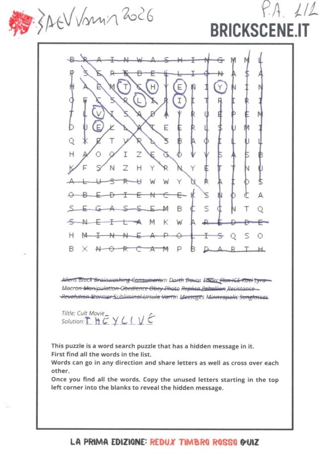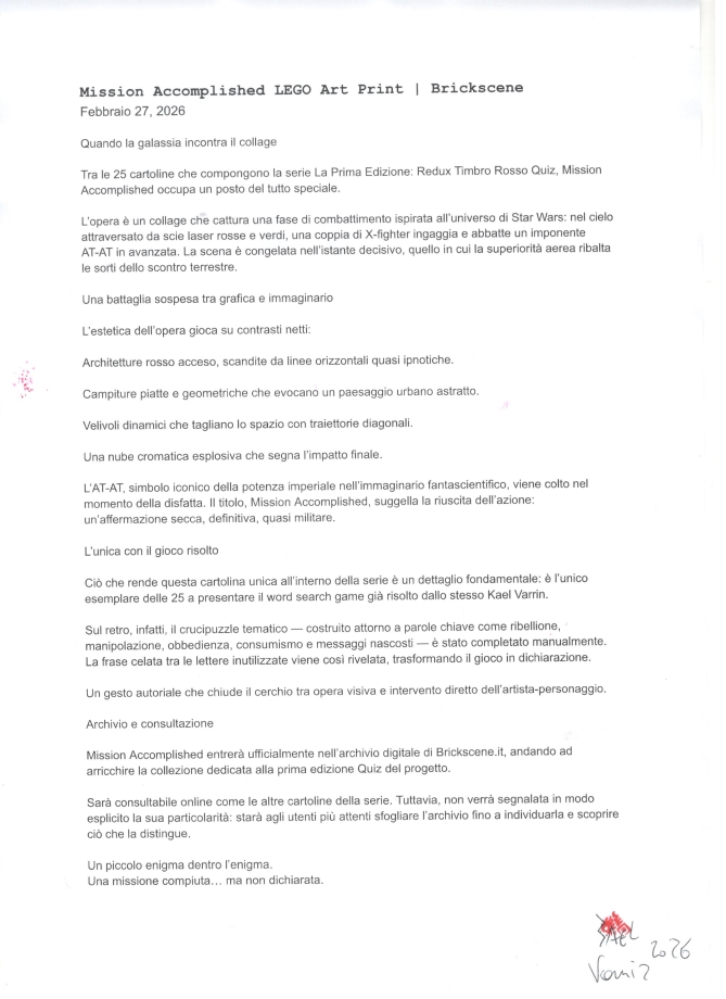 “La Prima Edizione: Redux Timbro Rosso Quiz”, con tiratura 1/1, timbrata, datata e firmata dall’artista + Word Search Game con frase nascosta con tema Cult Movie. 25 uniche cartoline che non sono semplici stampe: sono piccoli pezzi di un percorso artistico costruito a mano, una alla volta.