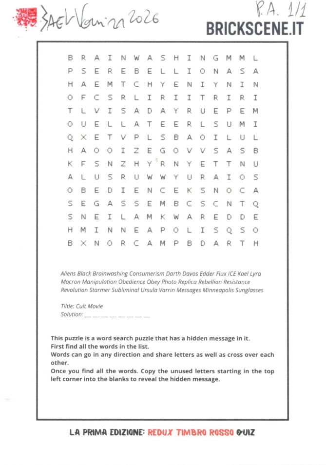 “La Prima Edizione: Redux Timbro Rosso Quiz”, con tiratura 1/1, timbrata, datata e firmata dall’artista + Word Search Game con frase nascosta con tema Cult Movie. 25 uniche cartoline che non sono semplici stampe: sono piccoli pezzi di un percorso artistico costruito a mano, una alla volta.