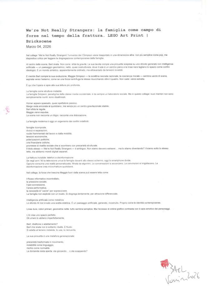 Donazione da 10 € in su → CARTOLINE in EDIZIONI LIMITATEOgni cartolina è un oggetto d’arte. Ogni copia è unica. Ogni edizione è irripetibile. Gli omaggi Brickscene sono ringraziamenti simbolici legati al supporto al progetto e variano nel tempo. Non si tratta di articoli fissi o di un catalogo commerciale: ogni periodo presenta una selezione diversa, in dialogo con il momento creativo e con il repertorio artistico attivo. Le cartoline inviate come omaggio saranno scelte “randomly” tra quelle a disposizione nel momento della donazione. Conto di stampare altre edizioni con cartoline diverse anche speciali (finitura diversa, carta speciale e dimensioni maggiori) molto presto. Al momento attingerò tra queste + alcune nascoste!