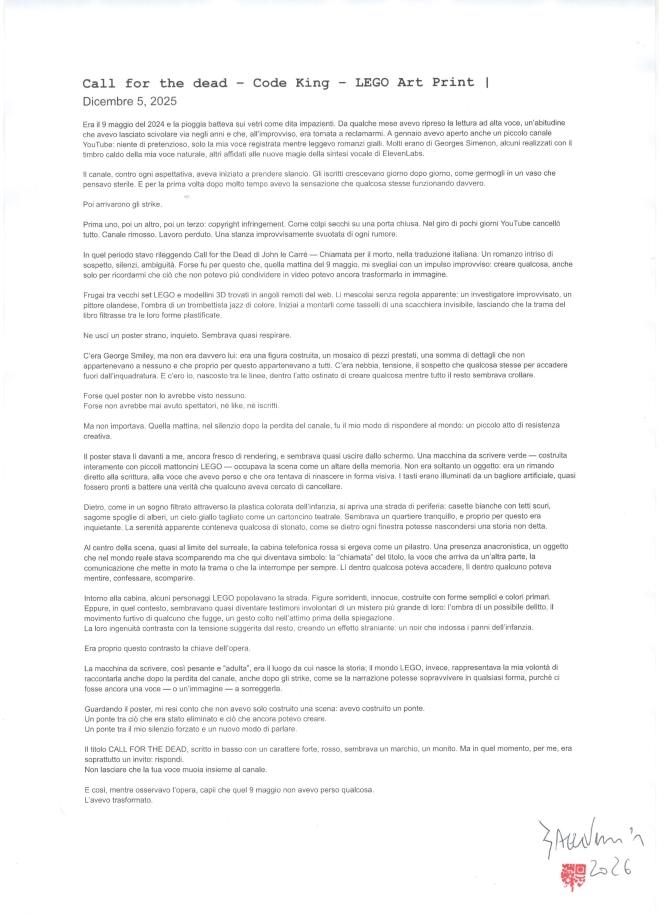 Donazione da 10 € in su → CARTOLINE in EDIZIONI LIMITATEOgni cartolina è un oggetto d’arte. Ogni copia è unica. Ogni edizione è irripetibile. Gli omaggi Brickscene sono ringraziamenti simbolici legati al supporto al progetto e variano nel tempo. Non si tratta di articoli fissi o di un catalogo commerciale: ogni periodo presenta una selezione diversa, in dialogo con il momento creativo e con il repertorio artistico attivo. Le cartoline inviate come omaggio saranno scelte “randomly” tra quelle a disposizione nel momento della donazione. Conto di stampare altre edizioni con cartoline diverse anche speciali (finitura diversa, carta speciale e dimensioni maggiori) molto presto. Al momento attingerò tra queste + alcune nascoste!