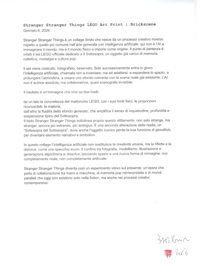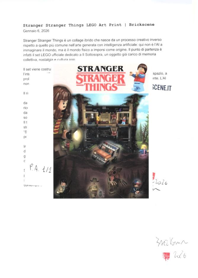 Donazione da 10 € in su → CARTOLINE in EDIZIONI LIMITATEOgni cartolina è un oggetto d’arte. Ogni copia è unica. Ogni edizione è irripetibile. Gli omaggi Brickscene sono ringraziamenti simbolici legati al supporto al progetto e variano nel tempo. Non si tratta di articoli fissi o di un catalogo commerciale: ogni periodo presenta una selezione diversa, in dialogo con il momento creativo e con il repertorio artistico attivo. Le cartoline inviate come omaggio saranno scelte “randomly” tra quelle a disposizione nel momento della donazione. Conto di stampare altre edizioni con cartoline diverse anche speciali (finitura diversa, carta speciale e dimensioni maggiori) molto presto. Al momento attingerò tra queste + alcune nascoste!
